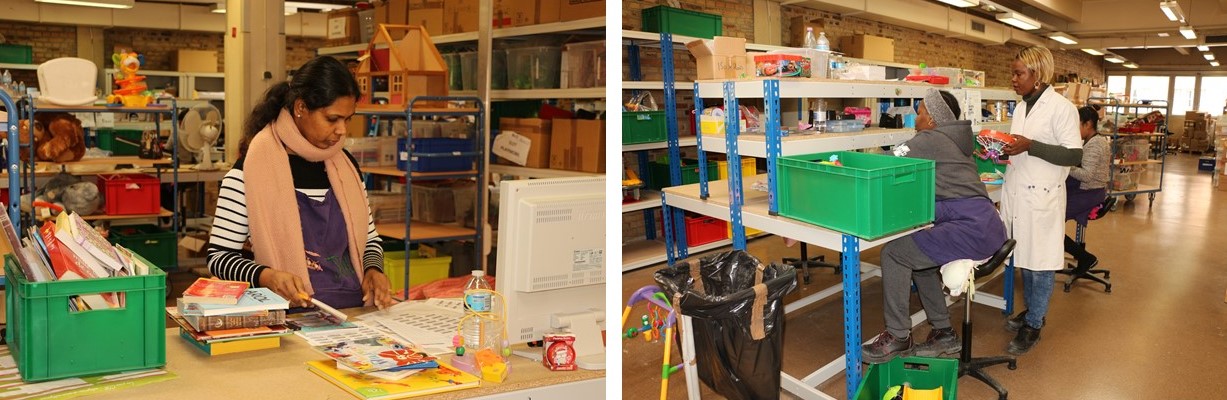 Rejoué is the only site for insertion of used toys in Île-de-France: the toys are collected, sorted, cleaned and sold at solidarity prices by thirty employees in insertion, 60% of whom are women. These women, who face difficulties finding a job, are accompanied individually to define their professional projects and solve their social problems.
