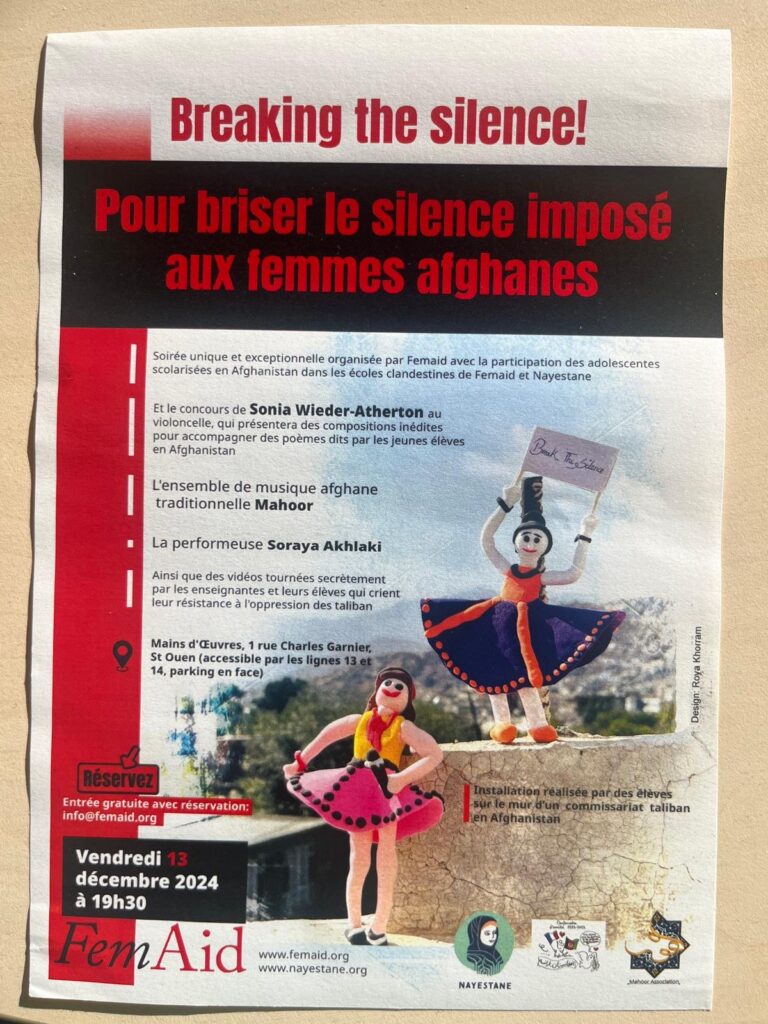A special evening event, titled “Breaking the Silence Imposed on Afghan Women by the Taliban,” will take place on December 13, 2024, at Mains d’Œuvres (Saint-Ouen). Admission is free with prior reservation: info@femaid.org.