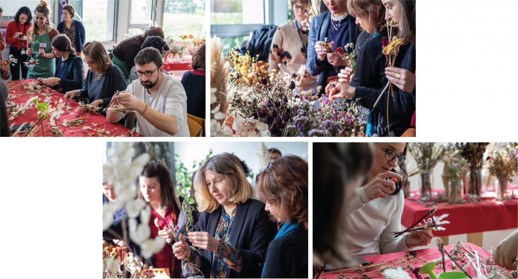 Cet atelier a permis à chacun.e de montrer ses talents créatifs en fabriquant des suspensions et des peignes floraux en compagnie de l’équipe de Fleurs de Cocagne, dont la mission est de favoriser l’insertion de femmes éloignées de l’emploi en Essonne, par le développement d’une activité de production horticole biologique et éthique.